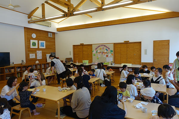 17日(火)に赤組さんの給食参観を実施しました。名阪食品さんの提供してくれる給食を食べる子どもたちの姿をお父さん、お母さんに見ていただくことができました。